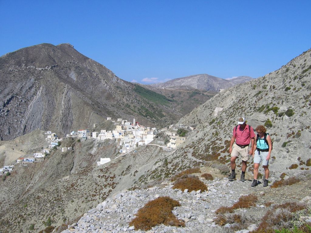 Resan börjar i Diafani, en liten hamn i norr. Härifrån tar du båt till en avskild vik och vandrar vidare längs stranden. Genom en stillsam dal tar du dig till det antika Vroukounta och sedan vidare upp till den traditionella byn Olympos, där invånarna fortfarande bär traditionella kläder och talar en lokal, gammal dialekt.