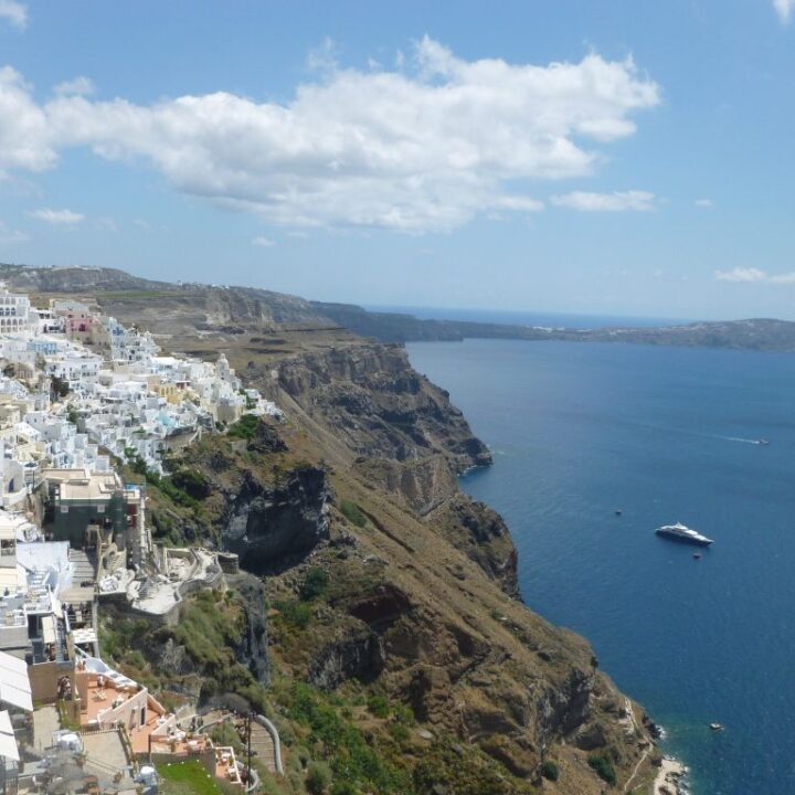 Santorini är en uråldrig ö formad av ett av historiens största vulkanutbrott. Här finner du vitkalkade kubformade hus, det lapisblå havet och solnedgångar som färgar kalderan i gyllene färger. Santorinis branta klippor, med sina färgade lager, är ett synligt resultat av vulkanen Thiras mäktiga explosion för tusentals år sedan. I den vattenfyllda kalderan finns fortfarande vulkanisk aktivitet, något du kan uppleva på nära håll om du besöker Kammeniöarna.